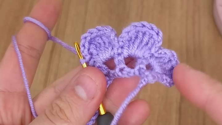 Второй ряд — вязание лепестков. Поднимитесь на 2 ВП, сделайте 2 накида, провяжите 5 столбиков с двумя накидами (СС2Н).