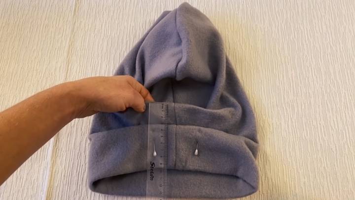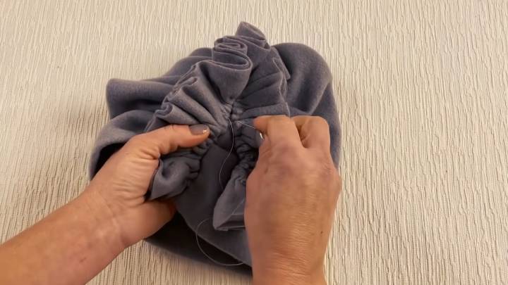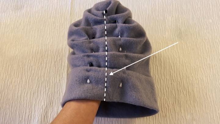 Выступающий конец шапки заверните внутрь и сколите вместе с ближайшей складкой. Проложите строчку на машинке по уже имеющемуся шву.