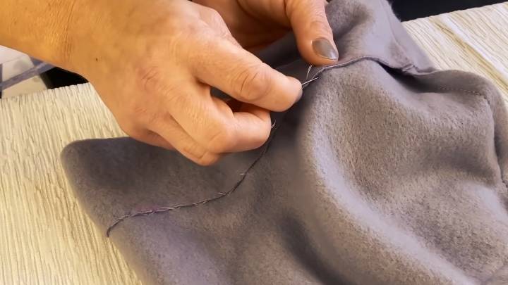 Подверните не зашитый край на 7 см внутрь, расправьте машинный шов. Сшейте вручную. Используйте потайной шов.