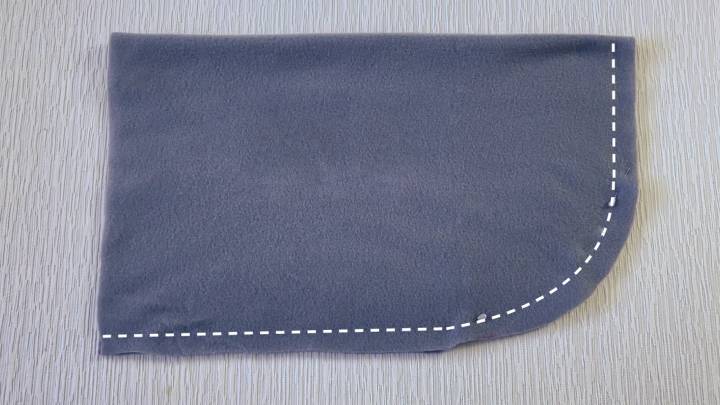 Сложите ткань пополам по длине. Сбоку отмерьте в обе стороны по 13 см. Приложите тарелку, нарисуйте дугу между точками. Обрежьте ткань.