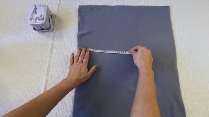 Подберите подходящую эластичную ткань. Это может быть флис, джерси, шерстяная ткань или любая другая на ваш вкус. Перенесите на неё обхват головы (56 см), а также расстояние от лба до затылка + 5 см (в данном примере получается 45 см).