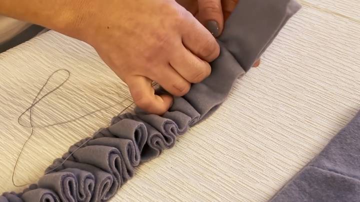 Почти готово! Чтобы украсить шапку, понадобится взять отрезок той же ткани 150*11 см. Сложите пополам по длине. Вручную сметайте ткань по сгибу, сильно затягивая нить.