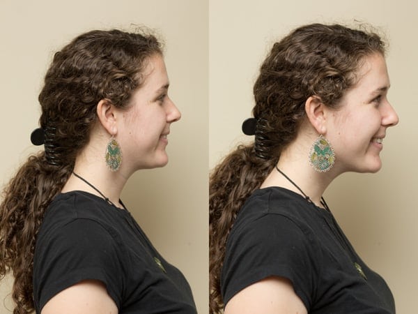 Когда кто-то стоит в своей обычной расслабленной позе или даже встает прямо, чтобы была красивая осанка, прямо под его подбородком появляется немного дряблости. Какими бы худыми вы не были, вы это увидите. Попробуйте придвинуть уши вперед.