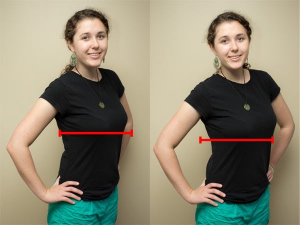 Красная линия показывает полную ширину плеч девушки, когда она стоит прямо. Небольшой поворот в сторону дает фотографию, на которой девушка все еще стоит лицом к камере, но уже с более худыми плечами.