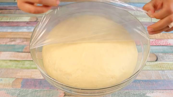 Обратите внимание! Количество муки варьируется от 530 до 600 г! Главное — не забить тесто мукой. Перестало липнуть к рукам — готово. Готовое тесто накройте плёнкой. Оставьте до увеличения в 2-3 раза (около 1—1,5 часов). [Еда без Труда] Ольга Мирошниченко/youtube
