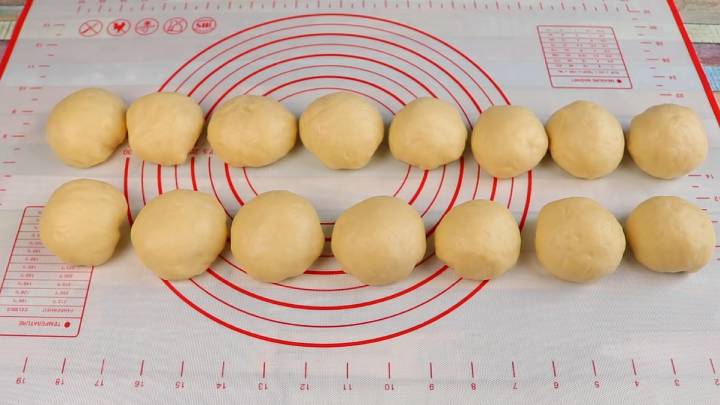 Разделите тесто на две части. Из каждой сформируйте колбаску и разделите на равные кусочки. Всего получится примерно 15 шт. Скатайте кусочки теста в колобки.