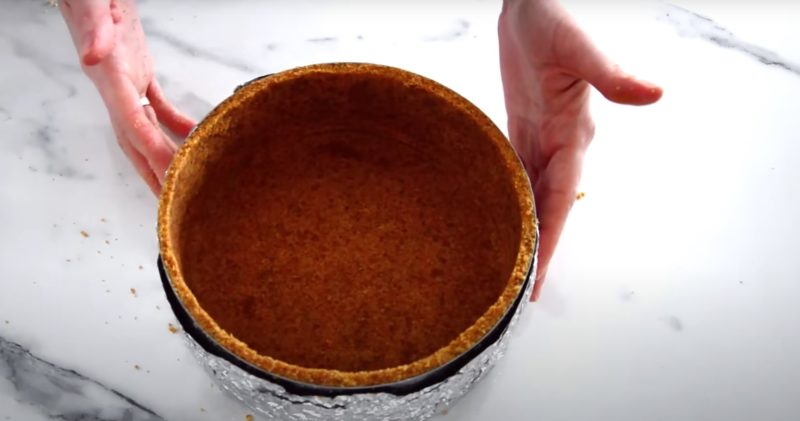 Установите кольцо на бумагу для выпечки и оберните форму фольгой. Выложите полученную массу в форму, сформируйте бортики и дно. Важно плотно утрамбовать печенье в форме, для этого можно использовать столовую ложку.