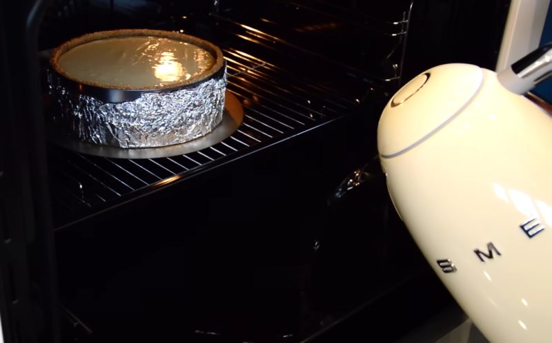 Чизкейк необходимо выпекать с паром. Для этого установите противень на нижний ярус духовки и налейте в него кипяток.