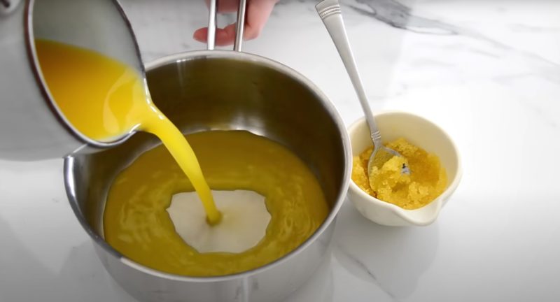 Замочите желатин в апельсиновом соке. Соедините апельсиновый сок и сахар, корицу и цедру апельсина и нагрейте ингредиенты.