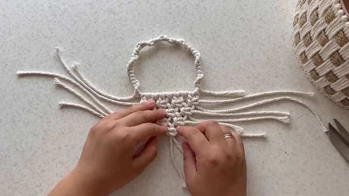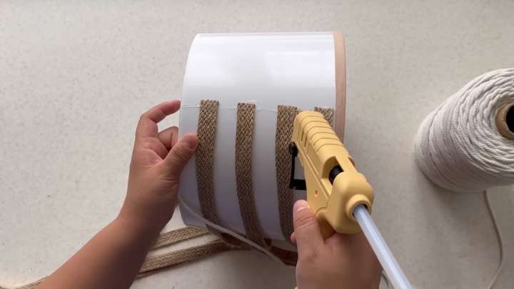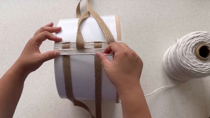 Начните переплетать их с верёвкой, которую проклеивайте по 4 полосы в ряду. Каждый ряд меняйте джутовые ленты на противоположные.