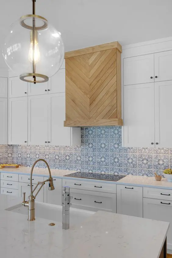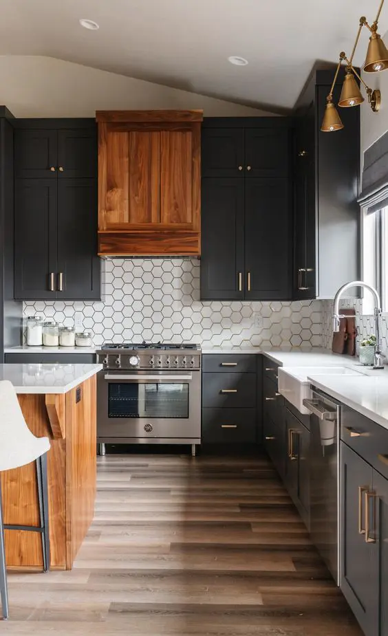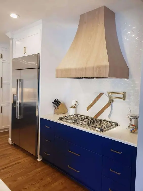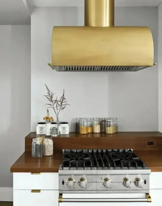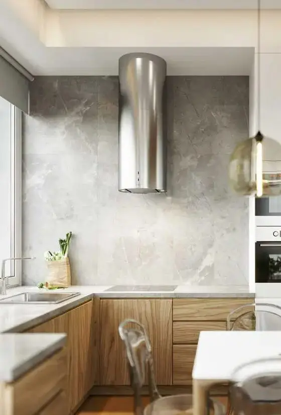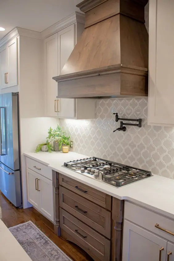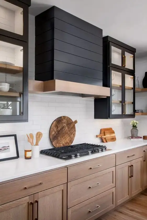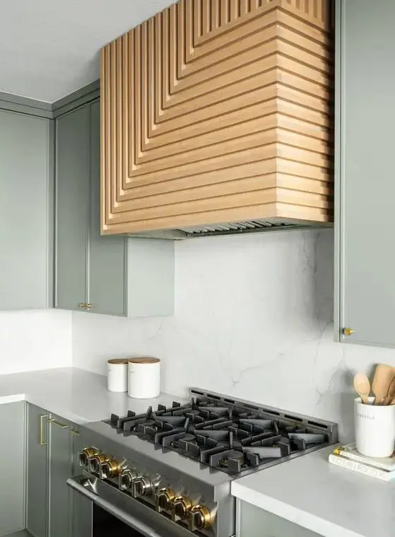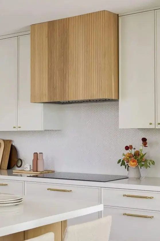 Одна из лучших идей — вытяжка, облицованная деревом или скрытая за деревянным коробом. Такой способ оформления подходит для кухонь, выполненных в разных стилях, ведь дерево — универсальный материал.