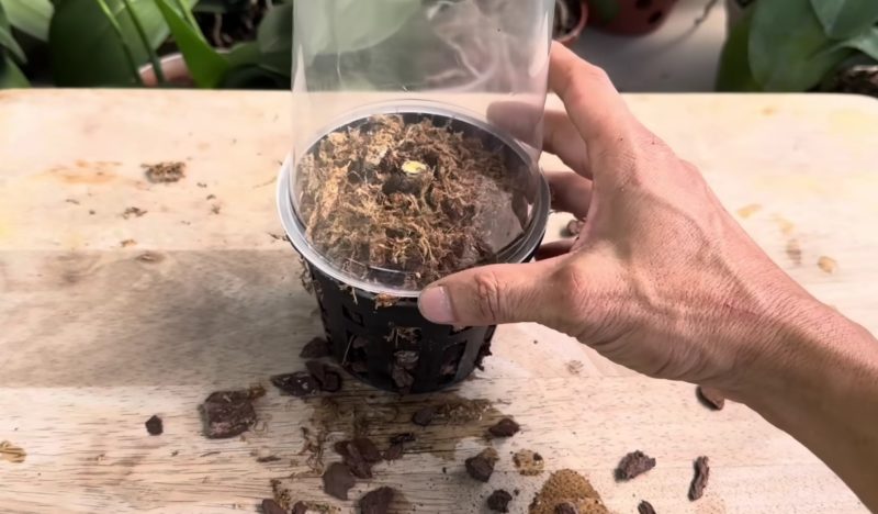 Накройте горшок пластиковым стаканчиком с несколькими отверстиями, чтобы создать благоприятные условия для восстановления орхидеи.
