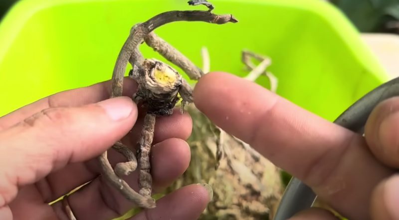 Удалите все листья и срежьте засохшую корневую систему. Срежьте небольшую часть ствола: если ствол внутри еще зеленый, то растение быстро восстановится.