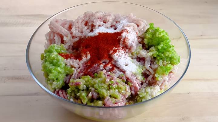Пропустите через мясорубку овощи (в т. ч. репчатый лук) и мясо. Вбейте яйца, посолите, добавьте любимые специи. Вымешайте фарш до однородности.
