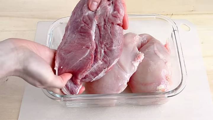 В классический мясной хлеб добавляют панировочные сухари/хлебную крошку, но они сильно «высушивают» готовое блюдо. Рекомендуем вам попробовать приготовить без них — тогда рулет будет очень сочным! Мясо можно брать абсолютно любое: хоть курицу, хоть свинину, хоть говядину, в том числе смешивать их между собой. Поэтому вкус готового блюда будет всегда разным! В данном МК хозяйка взяла пополам свиную лопатку и куриную грудку.