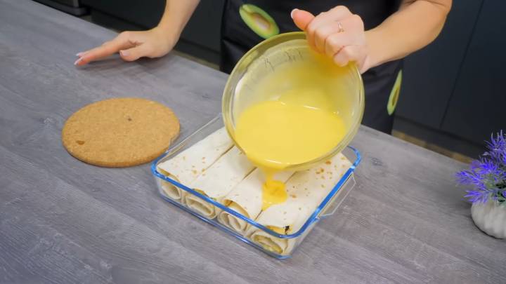 К яйцам добавьте сахар и сметану. Размешайте венчиком до растворения кристаллов. Вылейте заливку на рулетики из лаваша. Она должна полностью покрыть будущий пирог. Распределите её лопаткой.