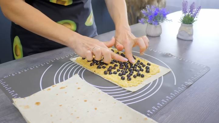 На половинку лаваша распределите по 1/4 начинки и столько же ягод. Можно брать замороженные! Закрутите лаваш в рулет, переложите в форму (смазывать ничем не нужно).