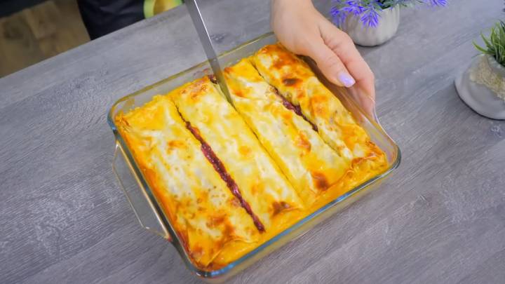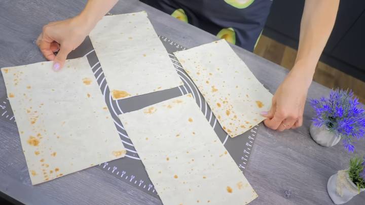 Тесто в данном рецепте заменено на тонкий лаваш. Возьмите 2 листа, разрежьте каждый напополам.