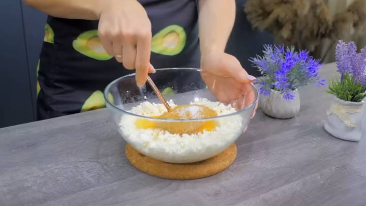 Возьмите творог в брикетах. Добавьте к нему яйца, сахар и немного соли. Перемешайте до однородности. Творожная начинка готова!