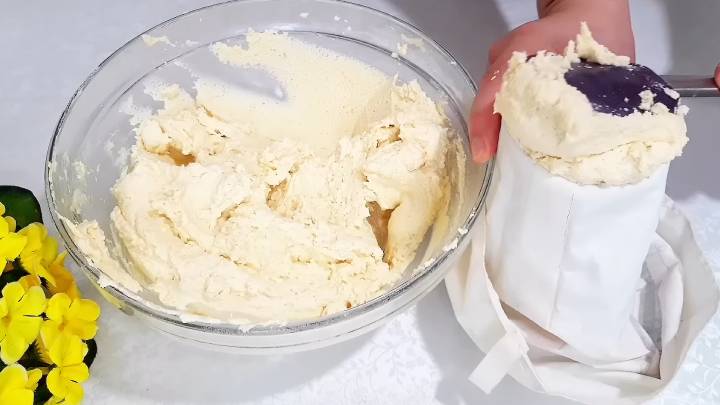 Просейте муку с разрыхлителем, замесите воздушное тесто. Для удобства формирования печенья переложите его в кондитерский мешок.