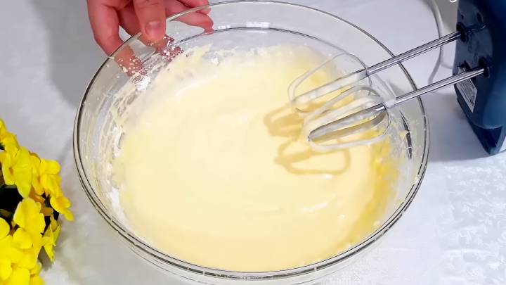 Мягкое сливочное масло взбейте венчиком добела в течение 5 минут. После этого добавьте майонез, сахарную пудру, яйца, ванилин и соль. Взбейте ещё раз до однородности ингредиентов. Масса должна получиться пышная.
