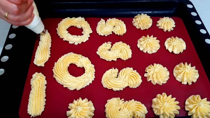 Выдавите печенья на форму с силиконовым ковриком или пергаментом. Дополнительно смазывать маслом нет необходимости.