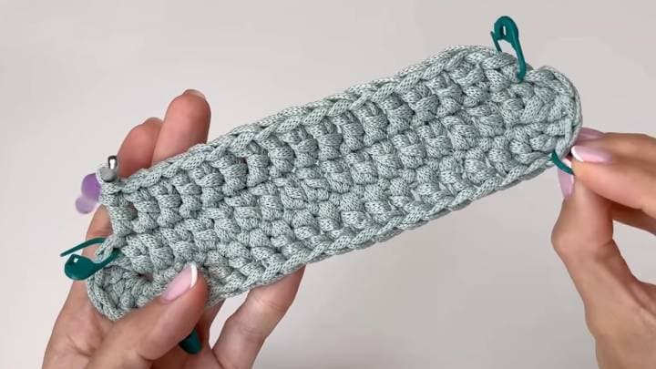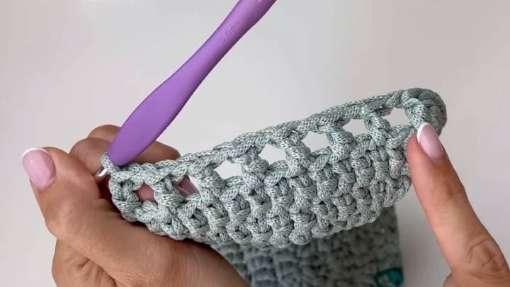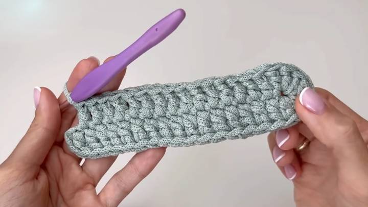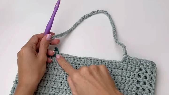 Двух рядов будет достаточно, чтобы ручки были крепкими и достаточно толстыми. Конец нити спрячьте в вязании.