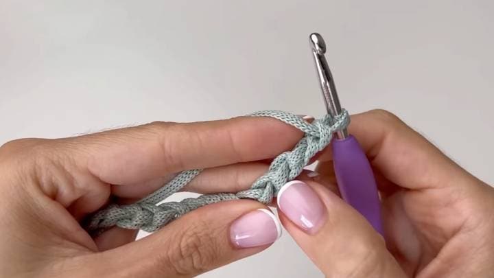 Пропустите 2 перемычки — это будет первый столбик. В 3-ю вяжите столбик с накидом (ССН). Таким образом, заполните всю цепочку. Когда дойдёте до конца, первоначальный узел распустите и в это отверстие провяжите 7 ССН, чтобы вязание повернулось на другую сторону. Там также провяжите по 1 ССН в каждую петлю. В конце, на повороте, провяжите 5 ССН в первую петлю. Присоединитесь соединительным столбиком (СС), поднимитесь на 1 столбик без накида (СБН) + 1 воздушную петлю (ВП).