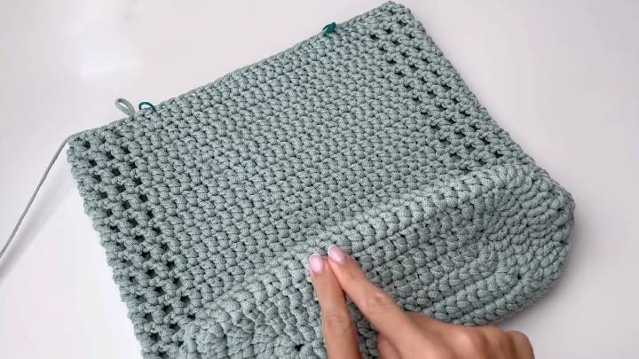 Таким образом, рисунок с ячейками формируется только по коротким сторонам прямоугольного дна — его ширине. Когда повернёте вязание на длинную сторону, просто вяжите ССН.