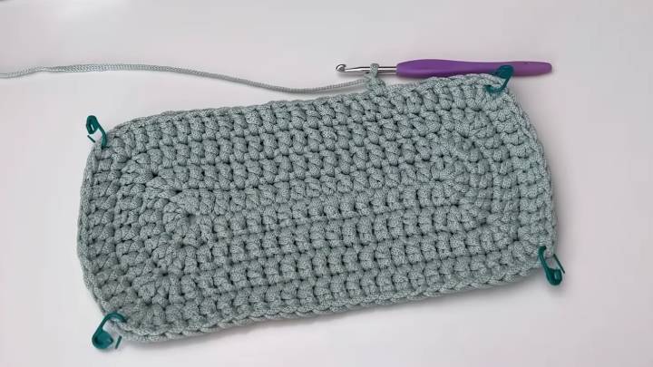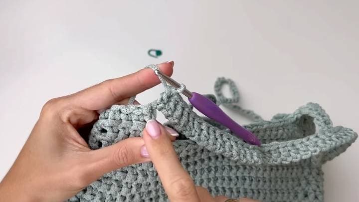 Теперь необходимо связать ручки. Поставьте маркеры на равном расстоянии с одной и другой стороны. Вяжите по рисунку, пока не дойдёте до первого маркера. Как только дошли — наберите цепочку из воздушных петель. Количество зависит от того, насколько длинные ручки вы хотите получить. В конце присоединитесь СБН ко второму маркеру. Далее вяжите по рисунку и с другой стороны сделайте то же самое.