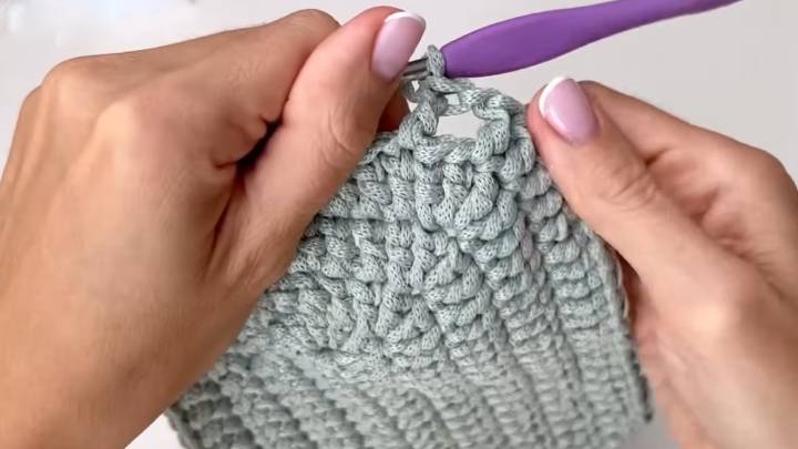 Дополнительных столбиков больше не нужно добавлять — теперь ряд за рядом вяжите, пока высота не начнёт вас устраивать. На каждый новый ряд переходите так, как было сказано выше: в конце ряда — соединительный столбик (СС) + подъём на 1 СБН + 1 ВП.