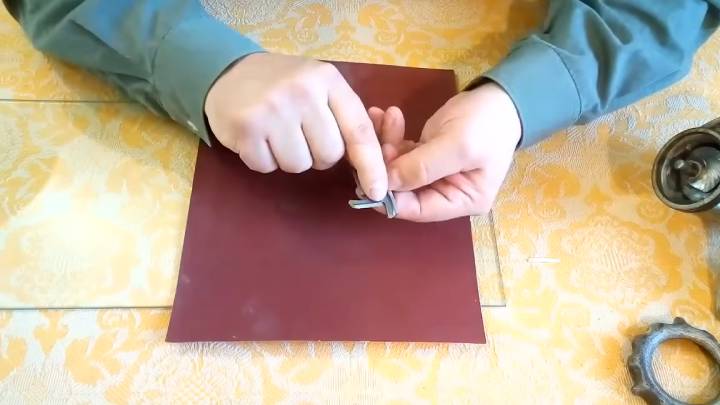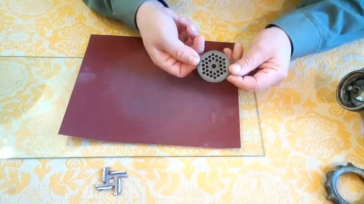 Её поверхность также должна быть идеально ровной, чтобы мясо быстро превращалось в фарш, а жилы не наматывались. Надавите пальцем ровно по центру и круговыми движениями заточите решётку с помощью наждачной бумаги. Повторите процедуру с обеих сторон, пока металл не будет счищен до идеально ровной поверхности.