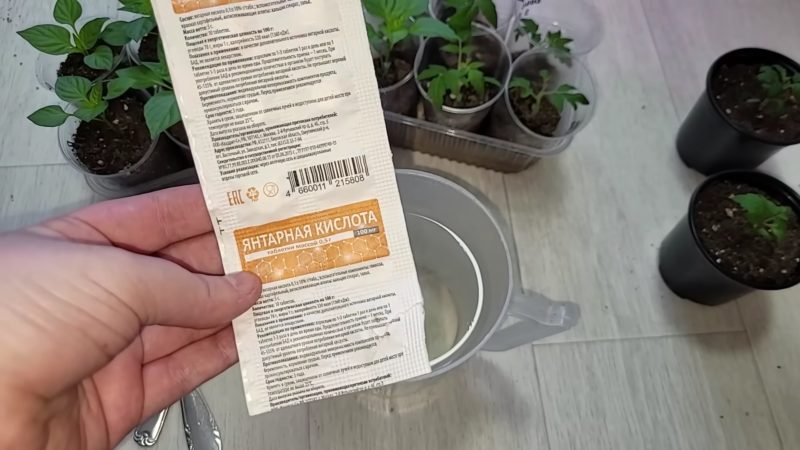 Янтарная кислота — незаменима для рассады. Это органическое вещество стимулирует активный рост корневой системы. Для первой подкормки рассады будет достаточно 1 таблетки янтарной кислоты на 1 литр воды.