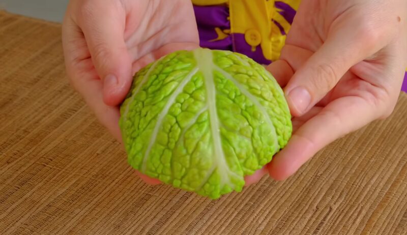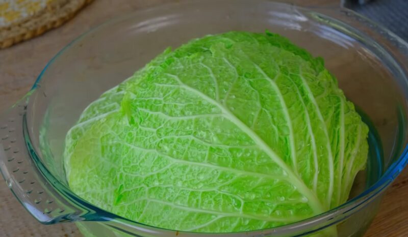 Разделите капусту на листья. Чтобы листочки стали мягкими и удобными в работе, залейте их кипятком и оставьте на 10-15 минут.
