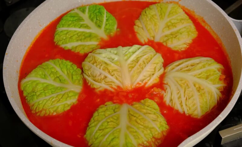 Для приготовления соуса к обжаренным луку и моркови добавьте томатную пасту, овощной бульон и чайную ложку сахара, которая поможет сделать вкус соуса более гармоничным. Выложите голубцы в соус и готовьте их на медленном огне под крышкой 15 минут.