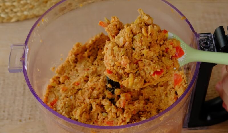В чашу блендера поместите вареную чечевицу, грецкий орех, помидоры, кетчуп и специи. Измельчите ингредиенты до получения неоднородной пюреобразной массы.