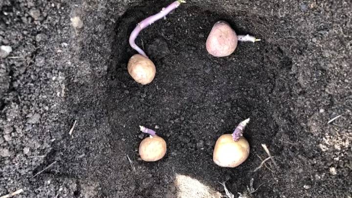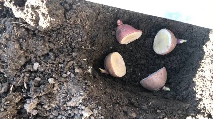 При посадке необходимо сделать ямку 20 см (высота грядки — около 30 см). Кусочки картофеля (2, 3 или 4 шт.) постарайтесь разложить на максимальном расстоянии друг от друга. Размер ростков должен быть примерно одинаковым — нет маленьких и больших.