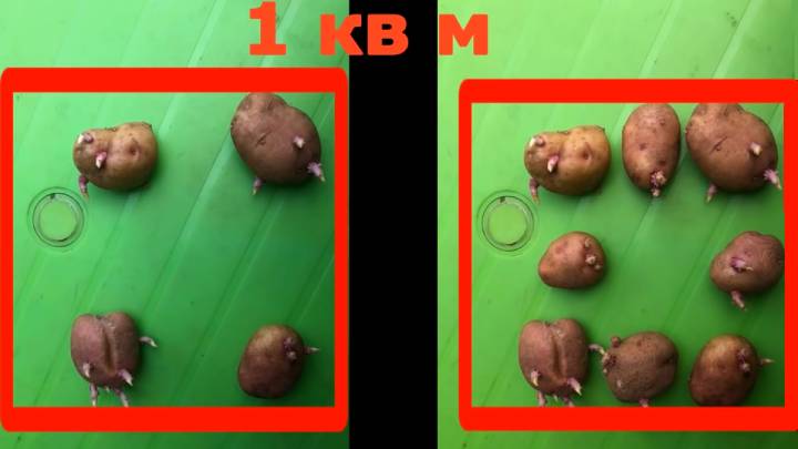 Потому что нельзя забывать про освещение и площадь питания. Эти два фактора и являются ключевыми для роста и развития клубней. На 1 кв. м. должно приходиться не более 20 стеблей. У ранних сортов может быть больше, у поздних — меньше. При классической посадке на расстоянии 50 см не подойдёт, например, крупный клубень с 8-12 ростками — стебли будут слишком густыми, им будет не хватать питания для нормального развития.
