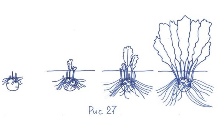 На рисунке ниже показаны стадии развития цельного клубня. Как правило, сначала прорастает один росток, затем второй, третий… Цельный клубень отправляет больше всего питания в самый верхний, первый, сильный росток. С образованием корней каждый отдельный стебель начинает жить своей жизнью, хотя они и находятся очень близко друг к другу. Все стебли находятся в конкурентной борьбе друг с другом внутри куста. Чем сильнее конкуренция (больше стеблей на 1 клубне), тем меньше получится урожай, поскольку «отстающие» стебли считаются сорняками, притеняют основное растение и угнетаются им.