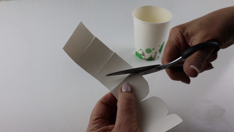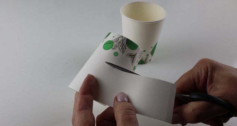 Сделайте разрез по боковому шву стаканчика и срежьте ободок. Разрежьте стакан пополам по горизонтали.