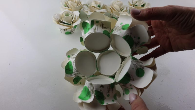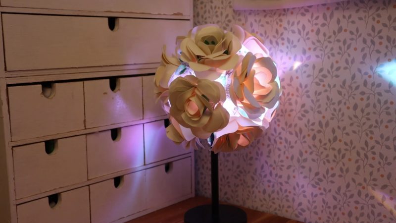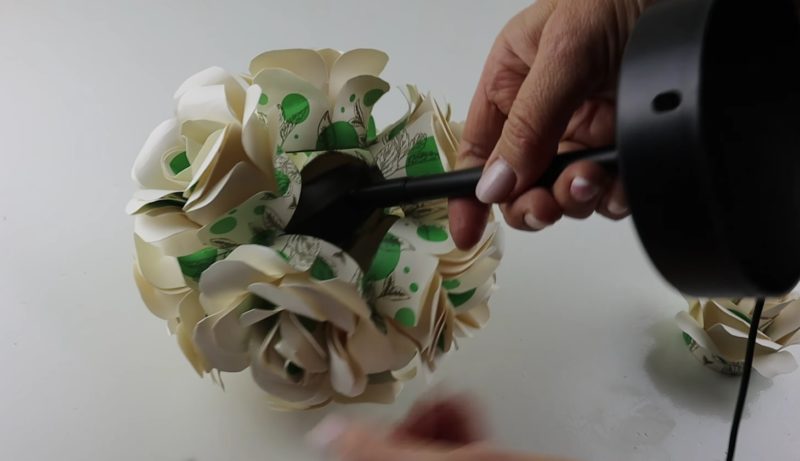 Следующий ряд роз приклеивайте ко второму ряду, сужаясь и оставляя место для последней розы. Наденьте абажур на лампу и закройте отверстие последней розой.