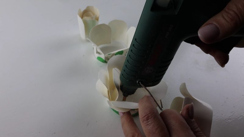 Каждую заготовку без дна скрутите спиралькой и приклеила к основанию розы.