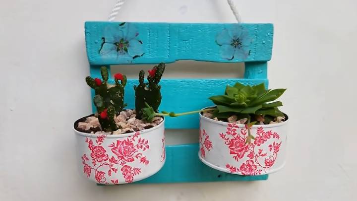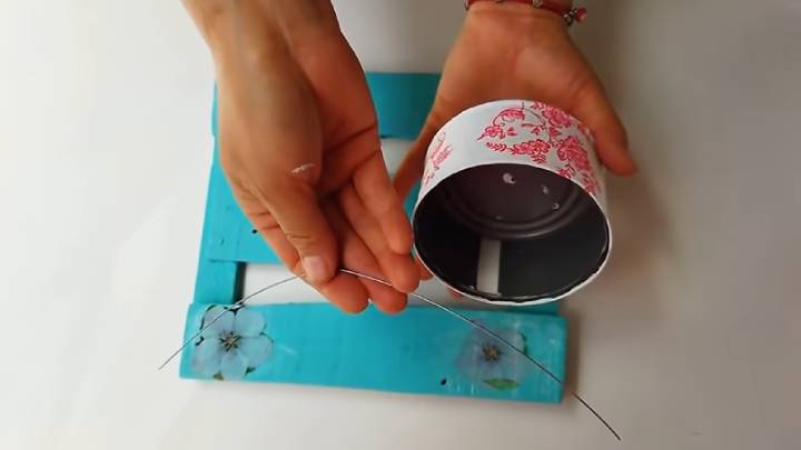 Также салфетками декорируйте доски. Сделайте в них пару отверстий. На проволоку закрепите консервные банки.