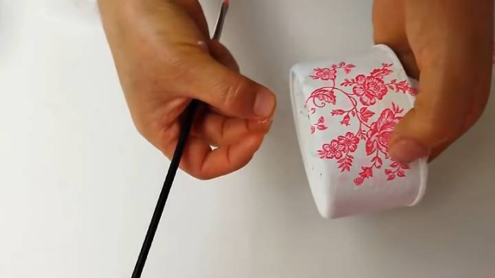 Покрасьте акриловой краской в белый цвет. После высыхания приклейте кусочек салфетки с рисунком. Используйте клей ПВА, немного разбавленный водой.
