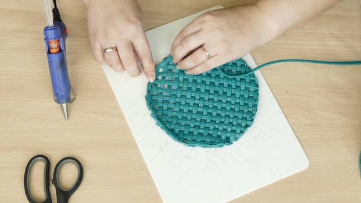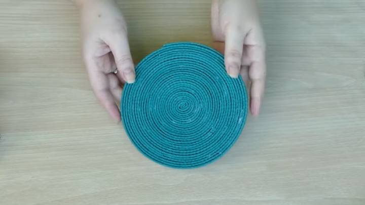 Нарежьте коврик для ванной на полосы. Подрежьте выступающие зубцы. Скрутите несколько полос, проклеивая их между собой. Получится круглое дно.