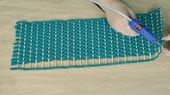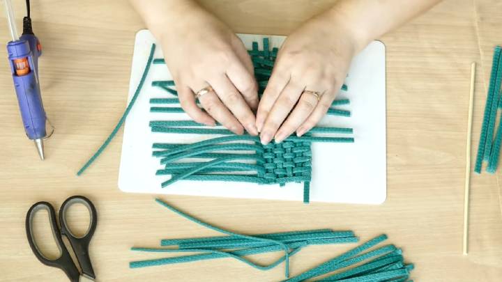 Длина верхней и нижней полос должна быть равна длине окружности дна. Теперь берите по одной полоске и переплетайте между шпажками. Фиксируйте термопистолетом.