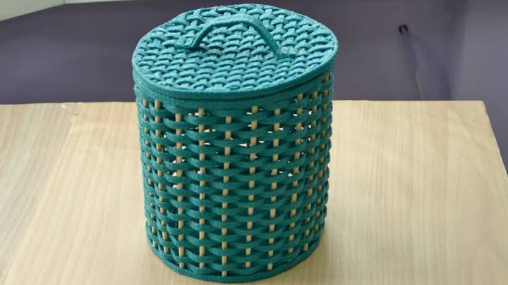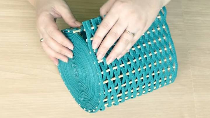 В результате получится чудесная плетёная корзинка. А в её основе — только деревянные шпажки и дешёвый коврик для ванной!