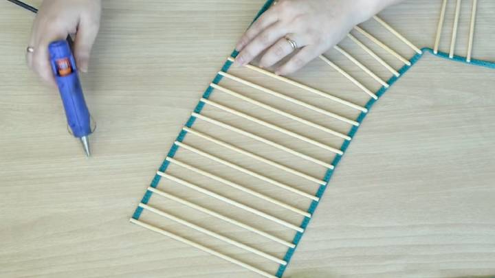 Подготовьте деревянные шпажки. Обрежьте их до длины 17 см, убирая острые концы. Возьмите полосу из коврика. На расстоянии 2 см сделайте отметки ручкой. Приклейте к ней шпажки. Сверху приклейте вторую полосу.