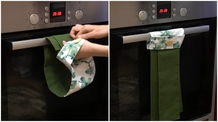 Из одного простого кухонного полотенца сделайте красивое, стильное и очень практичное! Его удобно повесить на ручку духовки — без пуговиц и липучек. Отличная идея из обычного полотенца!