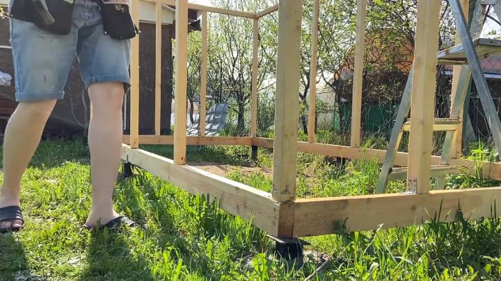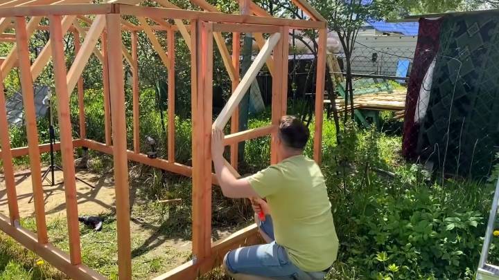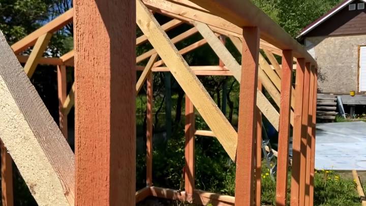 Из той же доски выпиливаются детали для сбора крыши. Всё выравнивается по уровню. Не забудьте про рёбра жёсткости + покраску!